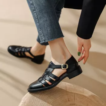 Genuine Leather Round Toe Summer Sandals for Women with Low Heel Comfort